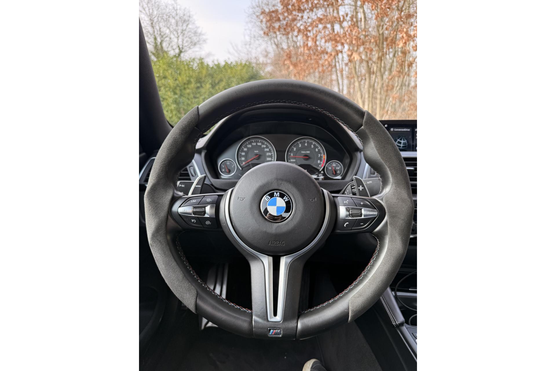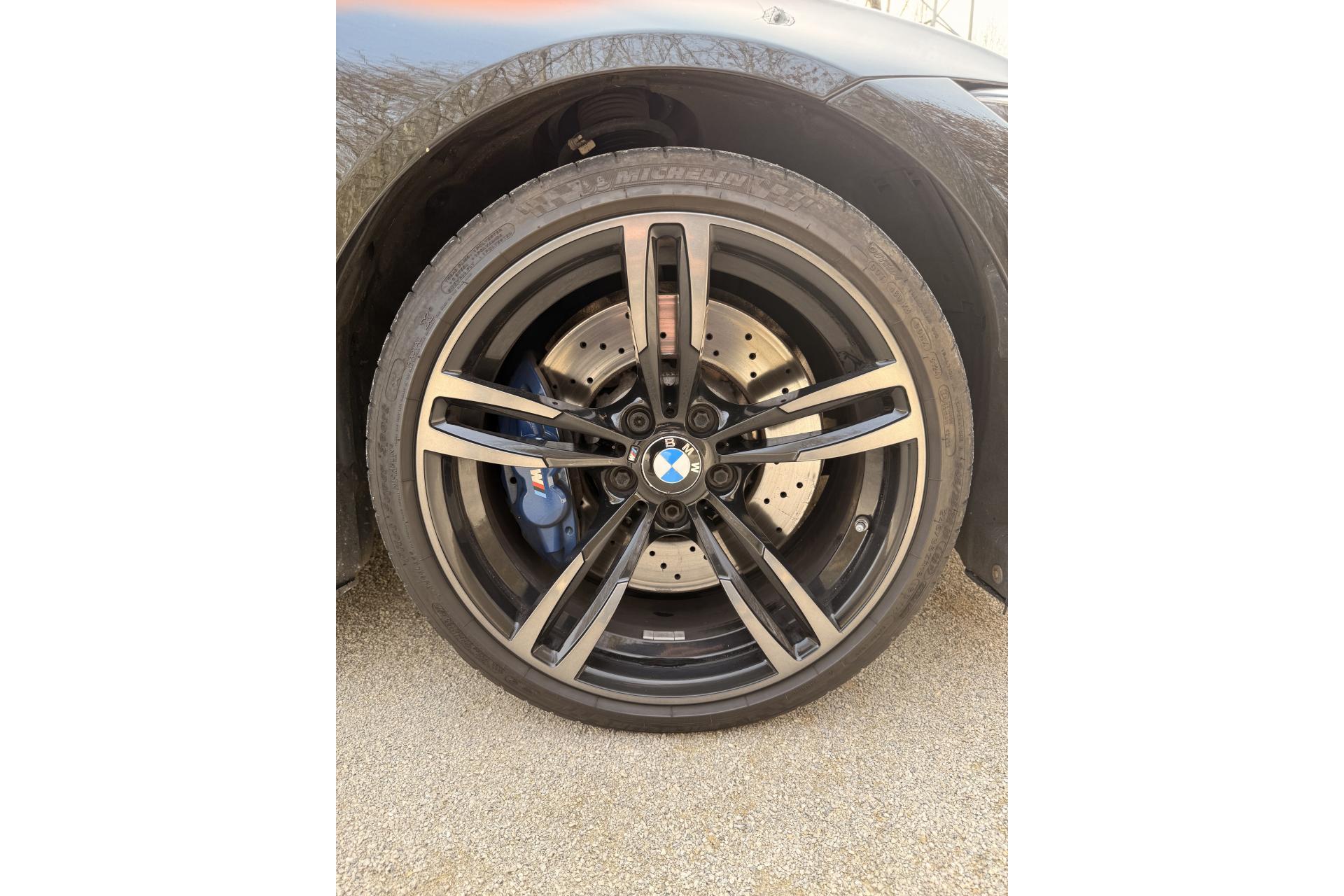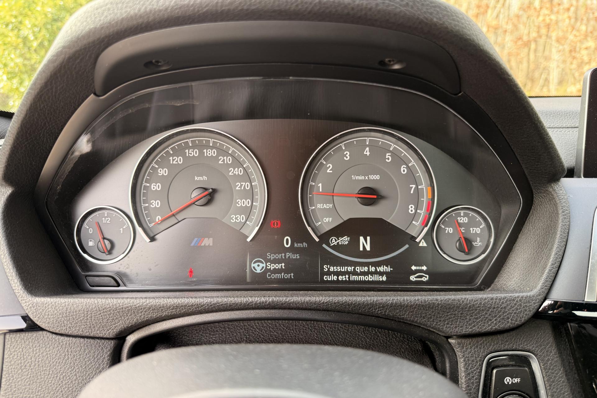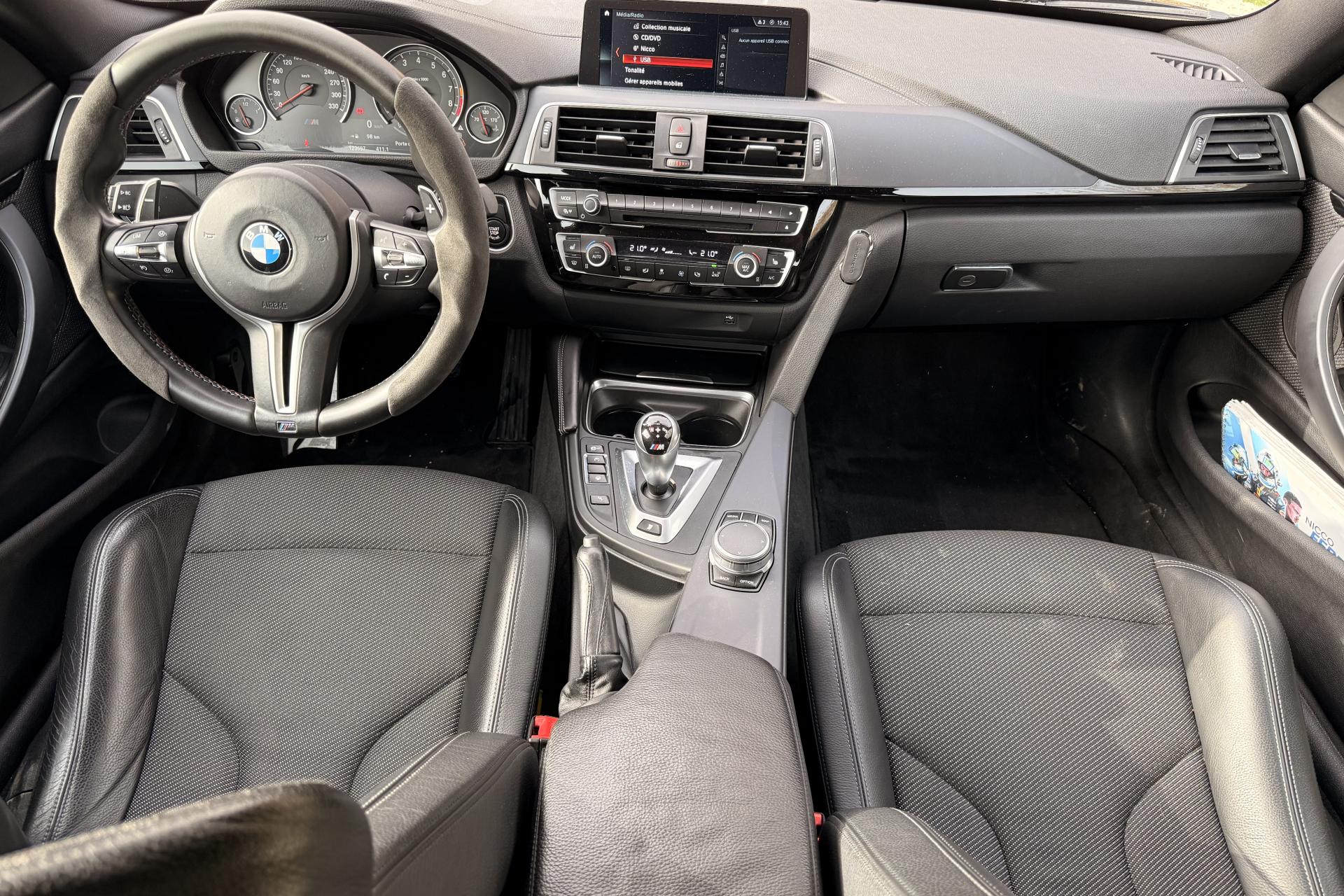 2 porte-boissons dans la console centrale avantABS (Antiblocage de roues)Accoudoir central avant coulissantAirbags frontaux conducteur et passager (déconnectable côté passager)Antenne de toit « aileron de requin »Appel d'Urgence IntelligentAutoradio BMW Professional CD compatible MP3, 6 haut-parleurs, prise AUX-IN, port audio USB, double Tuner, RDS et streaming audio Bluetooth (avec "Music Search")Baguettes de seuils avec inscription BMW MBanquette arrière 2 places avec dossiers rabattables asymétriquement 60/40Barre anti-rapprochement en fibre de carbone sous le capot moteurBoîte de vitesses M DKG 7 rapports à double embrayage avec DrivelogicCarnet d'entretien électronique embarqué "BMW Service History"Ciel de pavillon anthraciteClimatisation automatique 3 zones avec filtre microporeux et fonction de recyclage d'airDémarrage sans clé via le bouton de démarrage Start/Stop avec contour chroméDétecteur de pluie et allumage automatique des projecteursDétection de l'occupation du siège passager avantDifférentiel Actif M à commande électronique avec blocage du couple variant de 0 à 100%Direction à assistance électrique variable en fonction de la vitesseEclairage plafonnier soft-on/soft-off et éclairage du coffreEcran d'information central couleur 8.8" (22,4 cm) avec commande par "Controller" iDrive et 8 touches de raccourcis programmablesEcrous antivolFonction d'arrêt et de redémarrage automatique du moteurFreins à disques perforés hautes performances à étrier fixe peint en bleuGestionnaire M DriveInterface Bluetooth pour téléphone portable (mains-libres)Jantes en alliage léger 19" style 437 M à rayons doubles avec monte pneumatique mixte bicolores ''Ferricgrau''Limiteur et régulateur de vitesse avec maintien de la vitesse en descenteMotorisation BMW M TwinPower TurboNavigation multimédia ProfessionalOrdinateur de bord, Check-Control et indicateur de température extérieureProjecteurs Advanced Full LED avec quatre anneaux lumineux blancs à technologie LED pour éclairage diurneRadars de stationnement avant et arrière PDC avec représentation graphique des obstacles sur l'écran d'information centralRepose-pied conducteur siglé "M"Sélecteur de mode de conduite - 3 modes : "Efficient", "Sport", "Sport+"Services BMW ConnectedDriveSièges avant électriques à mémoires conducteur avec soutien lombaireSorties d'échappement rondes, doubles et chromées de chaque côtéTapis de sol en veloursTriangle de présignalisation avec kit de premiers secoursVerrouillage centralisé avec télécommandeVolant M gainé cuir avec touches multifonctions, deux touches M Drive